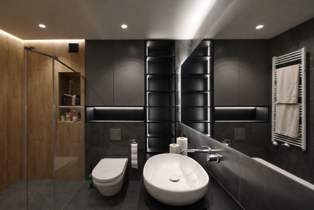 Lustro z podświetleniem LED oraz półki przy lustrze to proste elementy, które poprawiają funkcjonalność. Możemy też zaprojektować ukryte gniazdko na szczoteczkę elektryczną lub suszarkę.