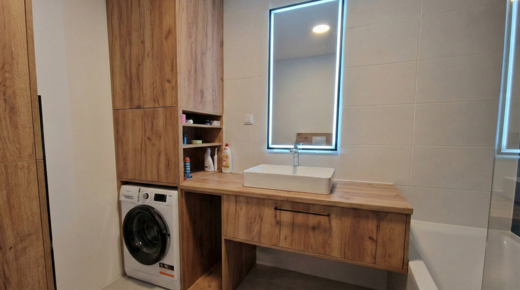 Zabudowa pralki w łazience pozwala utrzymać spójny wygląd. Projektujemy meble na wymiar tak, aby zapewnić wentylację i wygodne otwieranie drzwiczek. Nad pralką można dodać szafki na detergenty lub kosz na pranie – w zależności od układu.